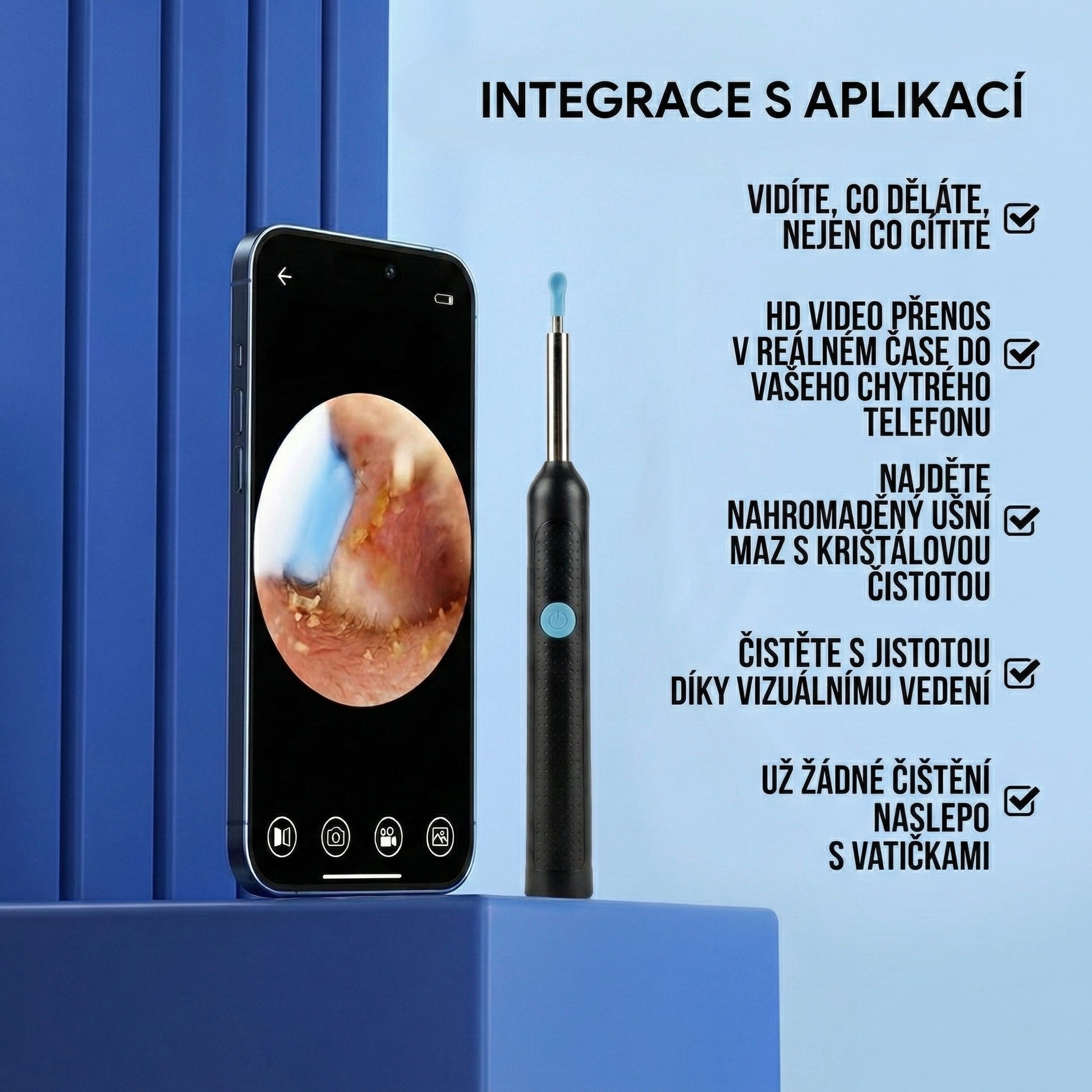 Získejte dokonale čistý obraz vnitřku ucha. Přesně vidíte každý svůj pohyb, což zajišťuje maximální kontrolu a bezpečí během čištění.