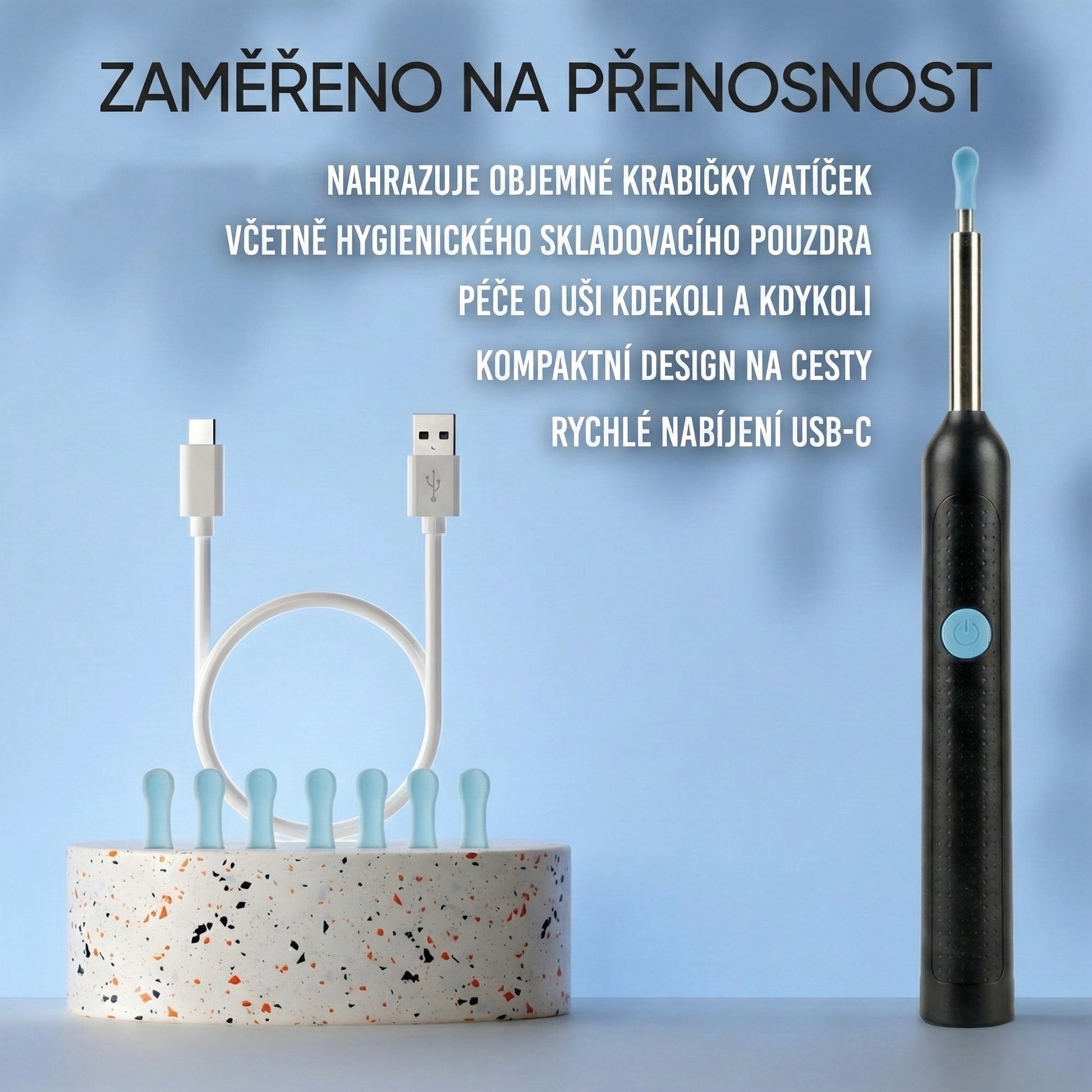 Sluchátka (AirPods atd.) zatlačují maz hlouběji do ucha a zároveň se sama špiní. Toto zařízení je nezbytné pro každého, kdo denně nosí sluchátka, aby udržel hygienu svých uší i funkčnost své elektroniky.